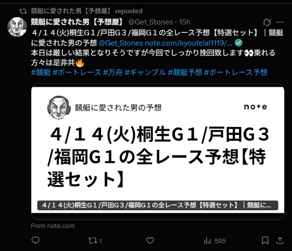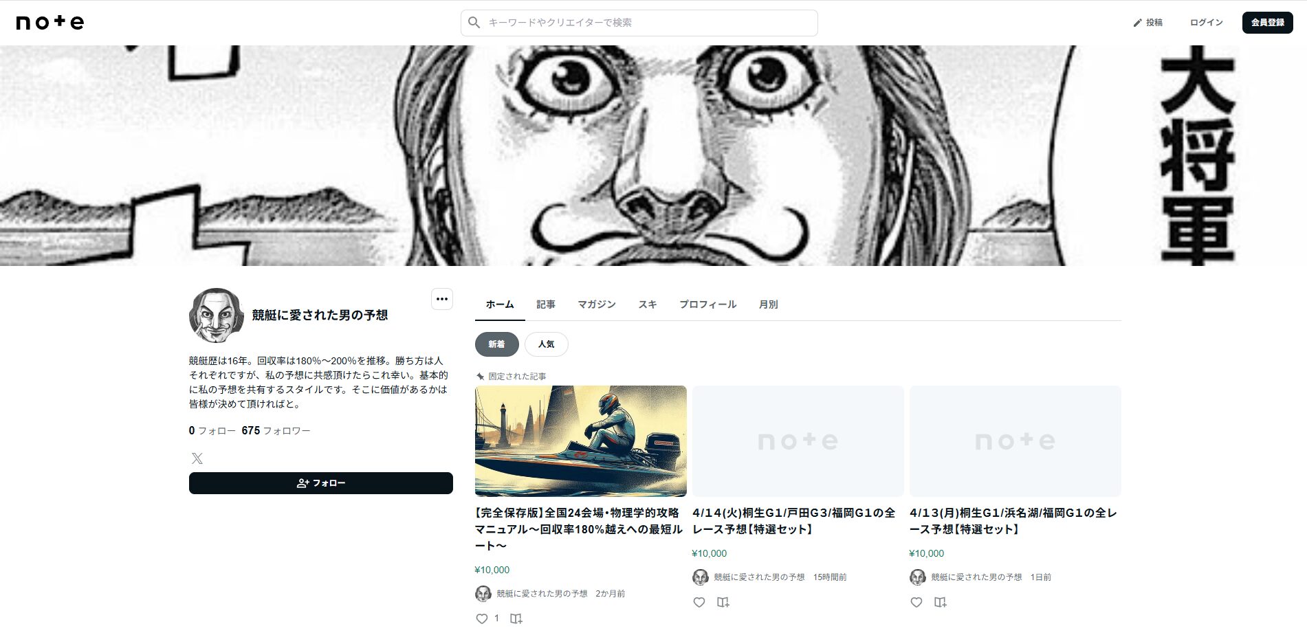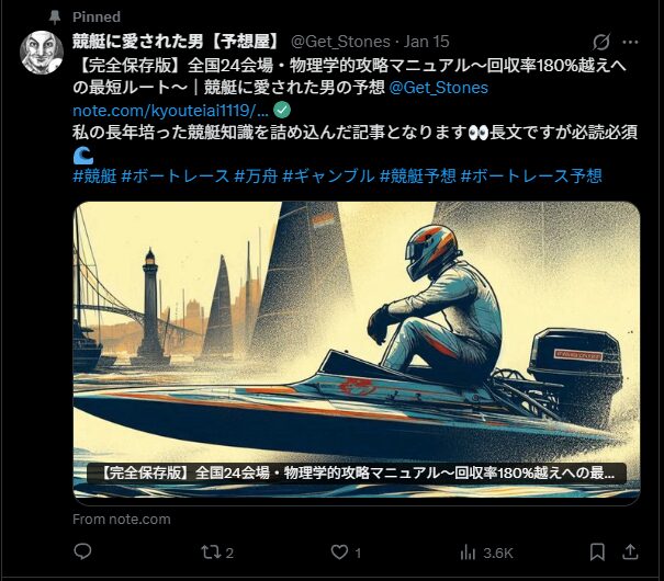 早速、『競艇に愛された男【予想屋】』のnoteに飛んでみました。