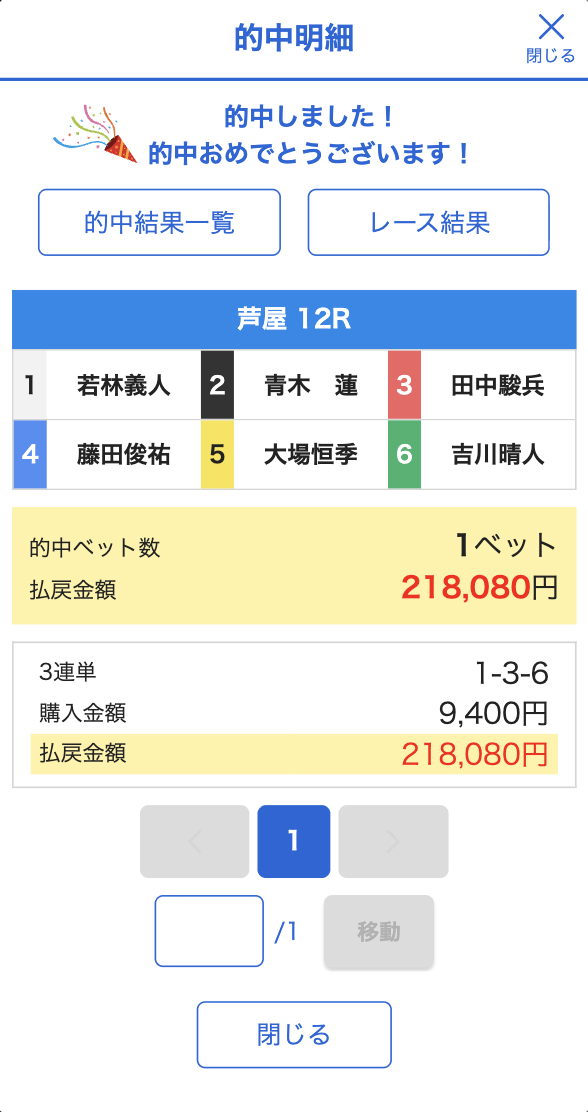 | 12/19 | 2ペア デイ | 芦屋11R→芦屋12R | 勝 | 218,080 |
