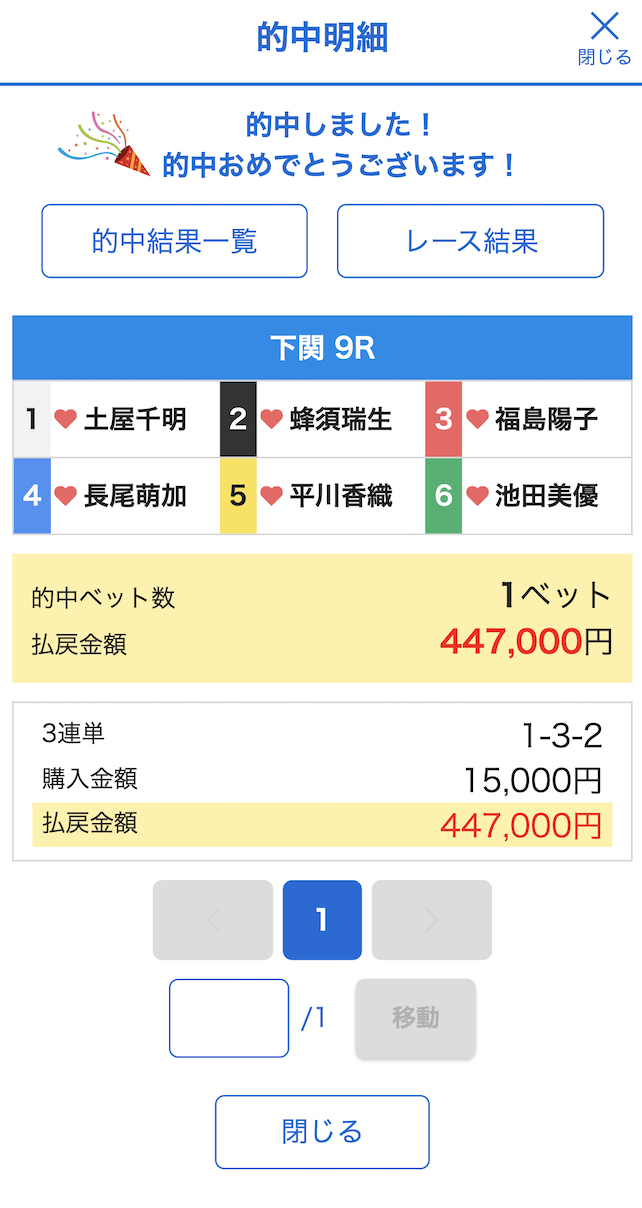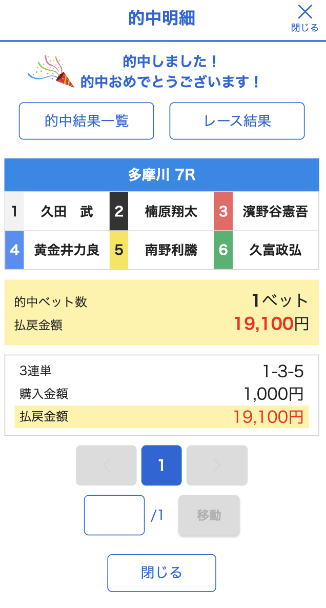 | 参加日 | 会場 | 勝敗 | 利益 | 買い目画像 | 的中画像 |