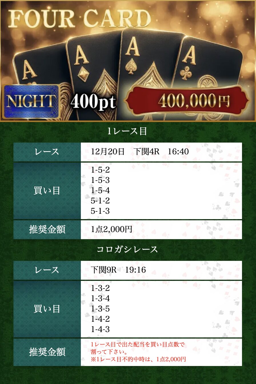 | 12/20 | 4カード ナイト | 下関4R→下関9R | 勝 | 447,000 |