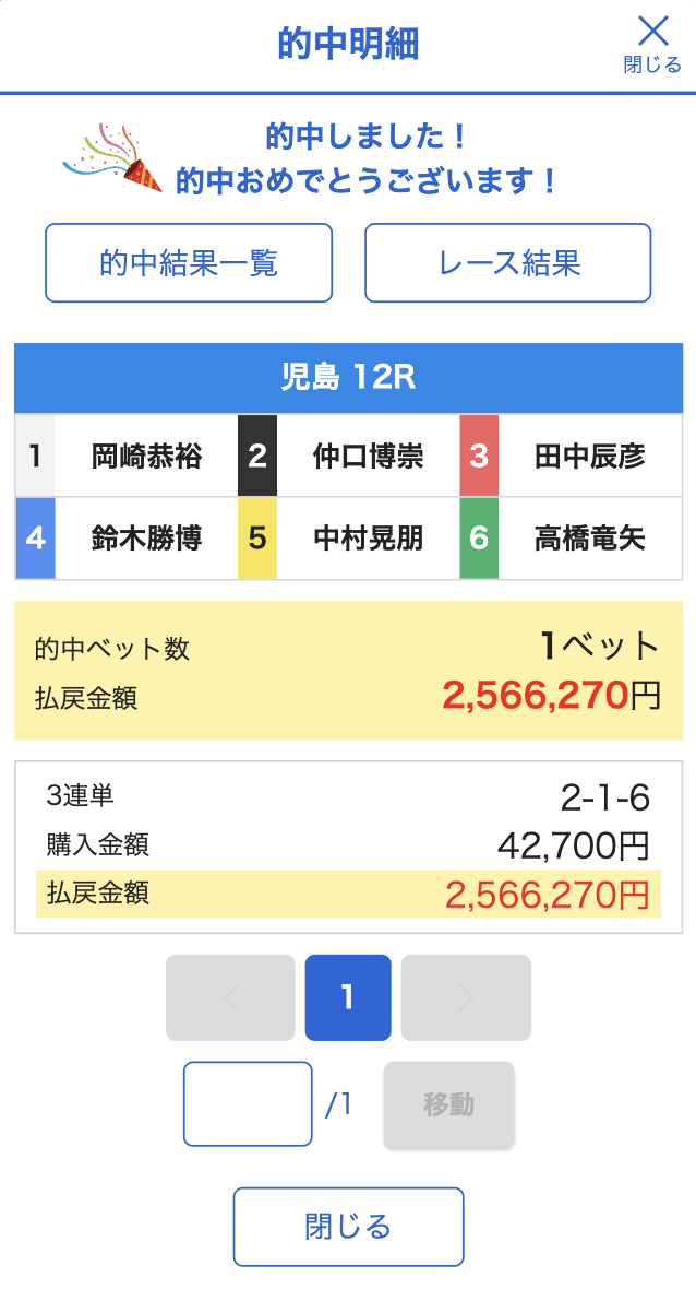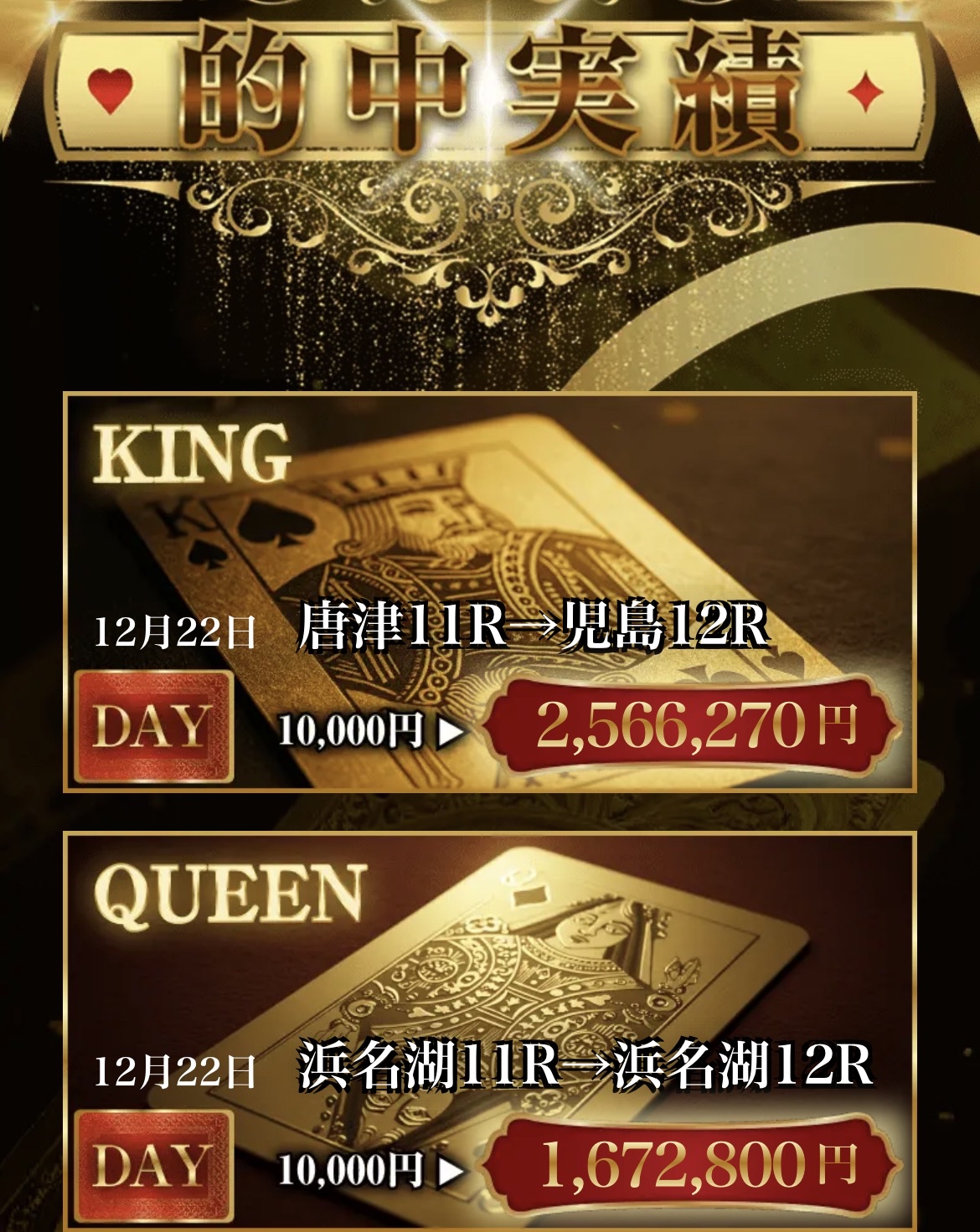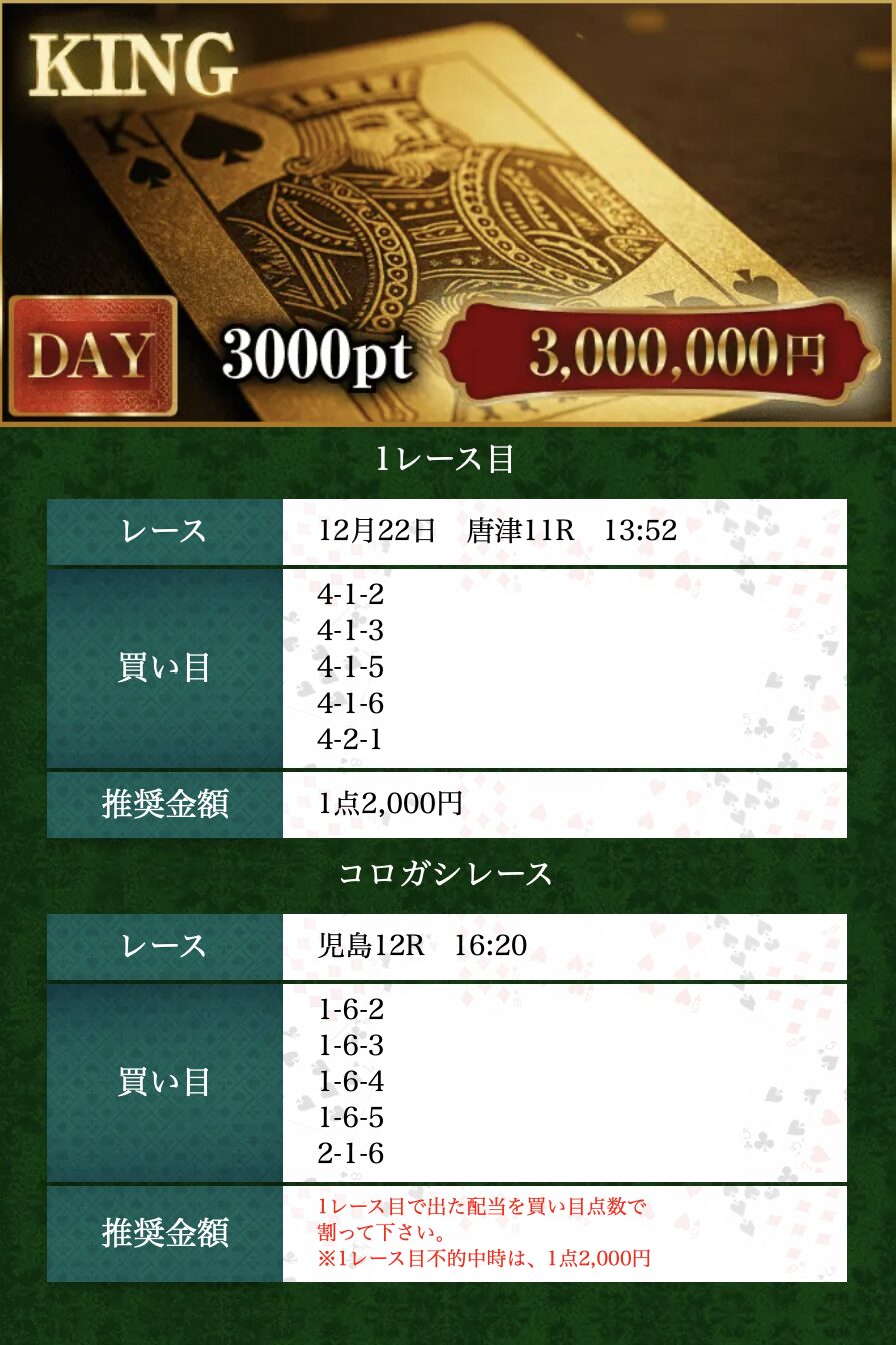 | 12/22 | キング デイ | 唐津11R→児島12R | 勝 | 2,566,270 |