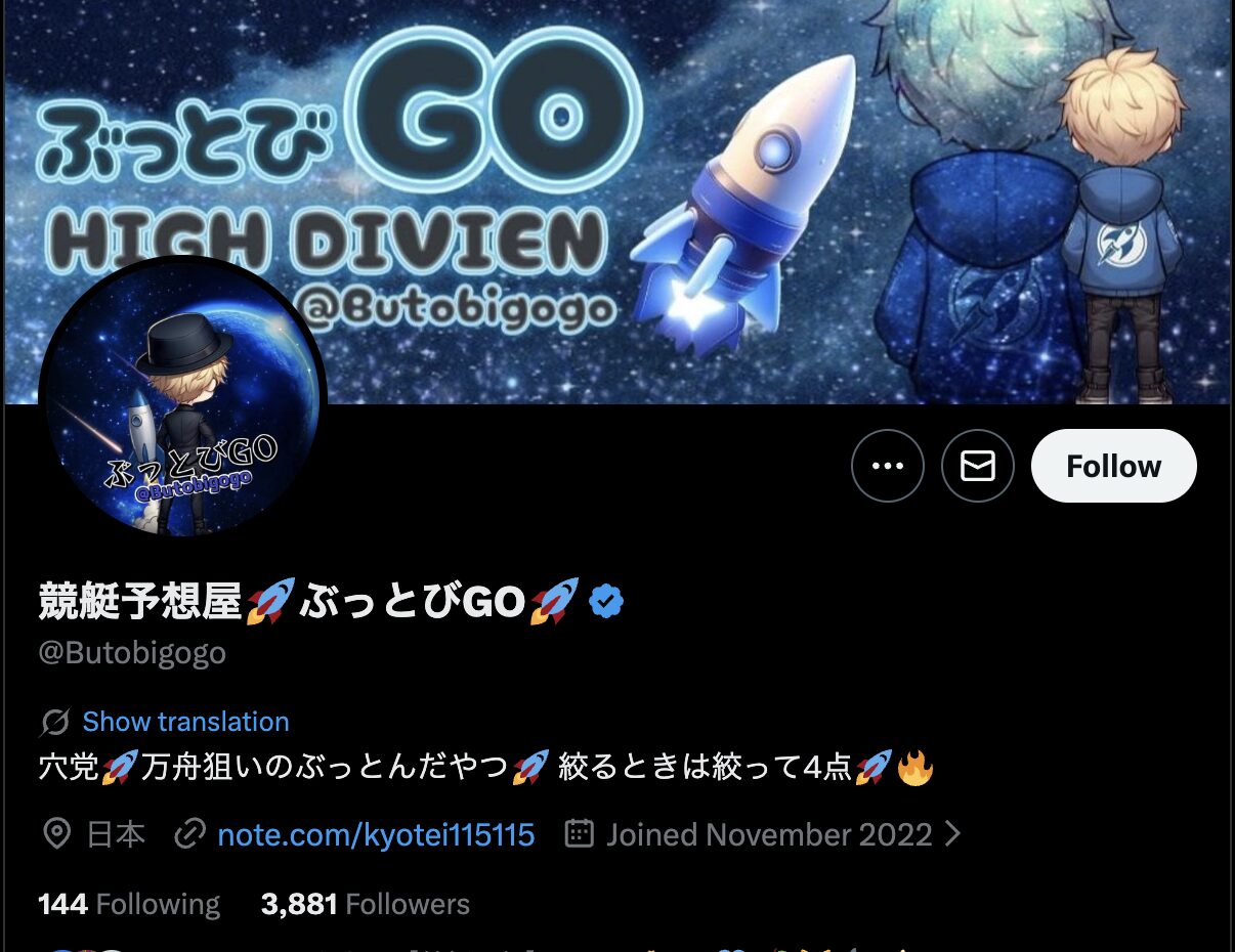 競艇インフルエンサー・【競艇予想屋🚀ぶっとびGO🚀】のX(Twitter)はこんな感じ