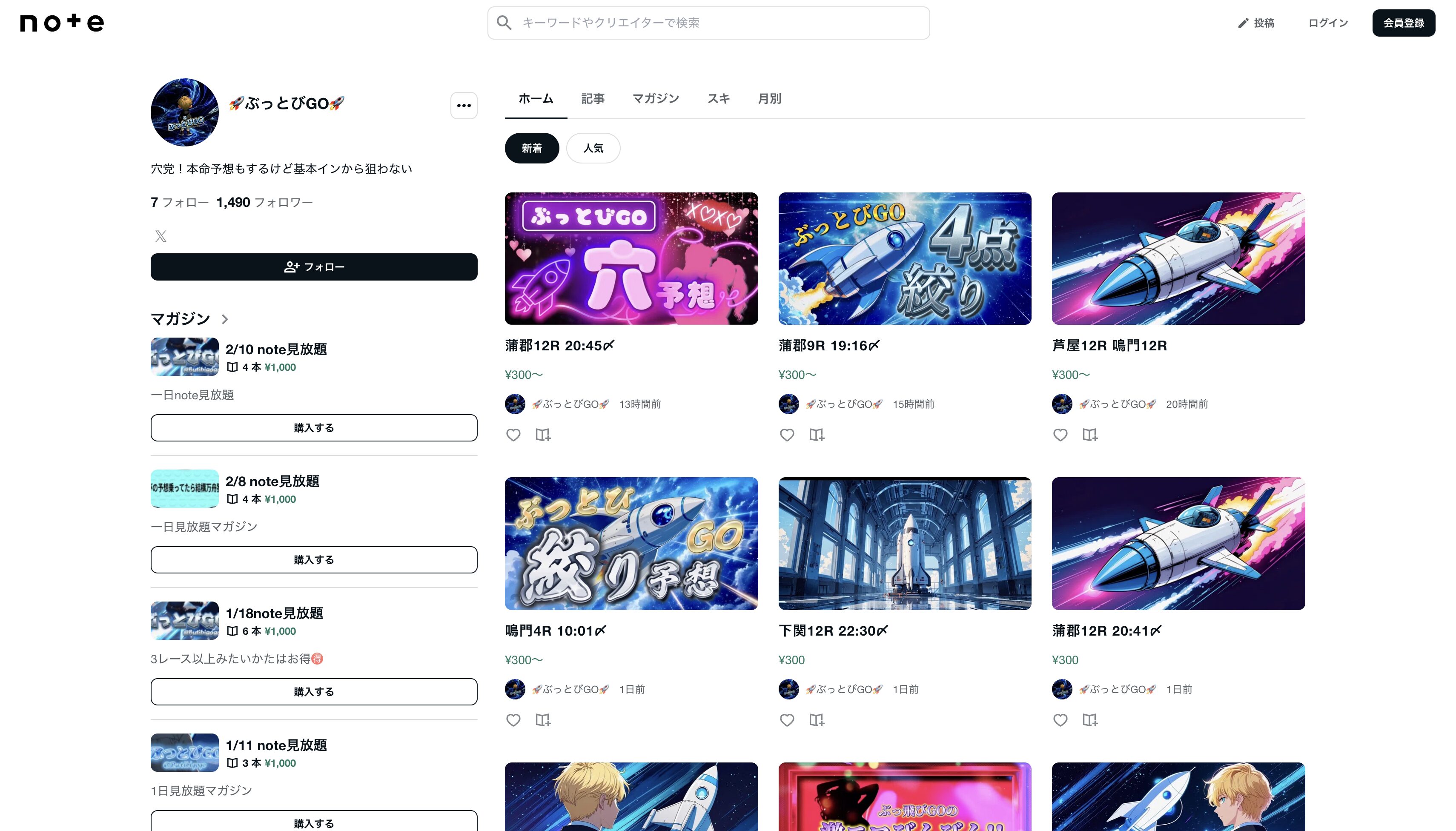 まあひとまずプロフィールにもあった通り、【競艇予想屋🚀ぶっとびGO🚀】のnoteを見ていきましょうか。