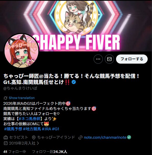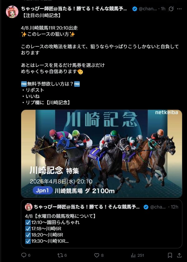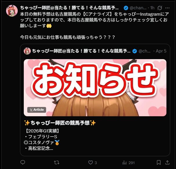 競馬インフルエンサー・【ちゃっぴー師匠】のX(Twitter)はこんな感じ