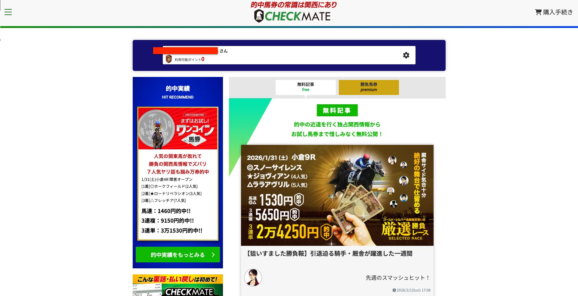 【競馬チェックメイト(CHECK MATE競馬)】の会員ページを検証してみた