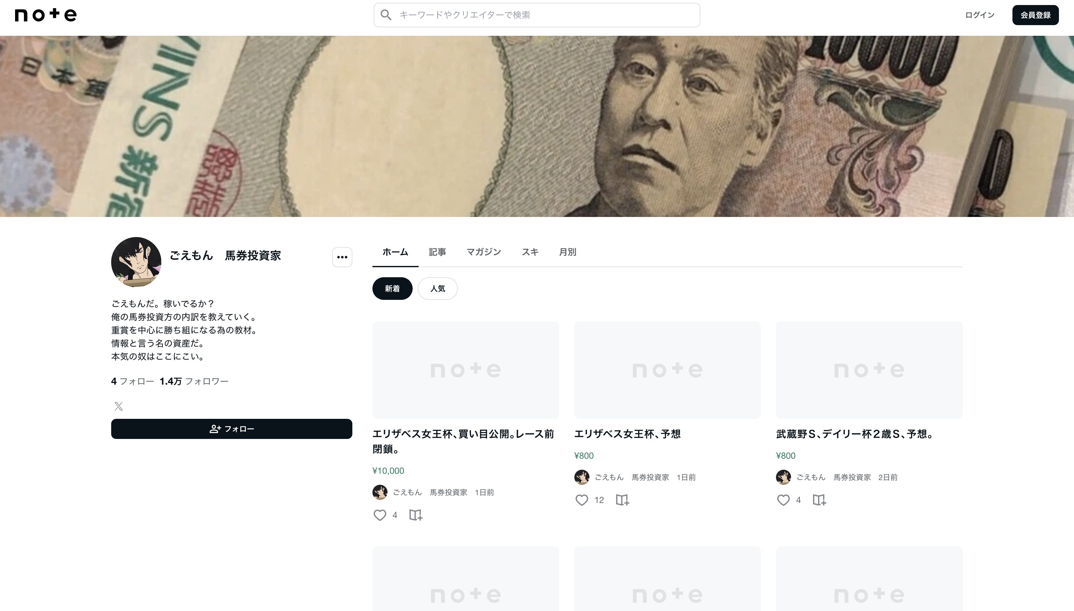 プレゼント企画をやっていたり、どうやらnoteで予想を売っているみたいですね。