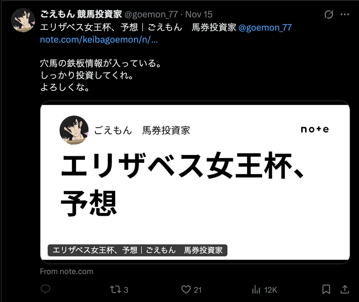 早速、【ごえもん競馬投資家】のnoteに飛んでみました。
