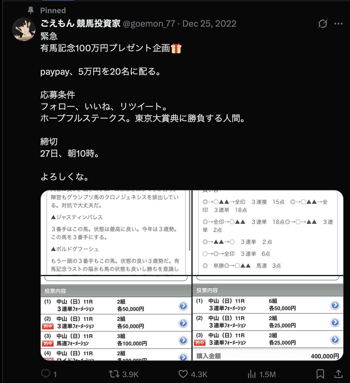 【ごえもん競馬投資家】は投稿を見る限りだとプレゼント企画をやっているみたいです。