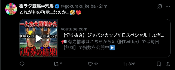 競馬インフルエンサー・【極ラク競馬@穴馬】のX(Twitter)はこんな感じ