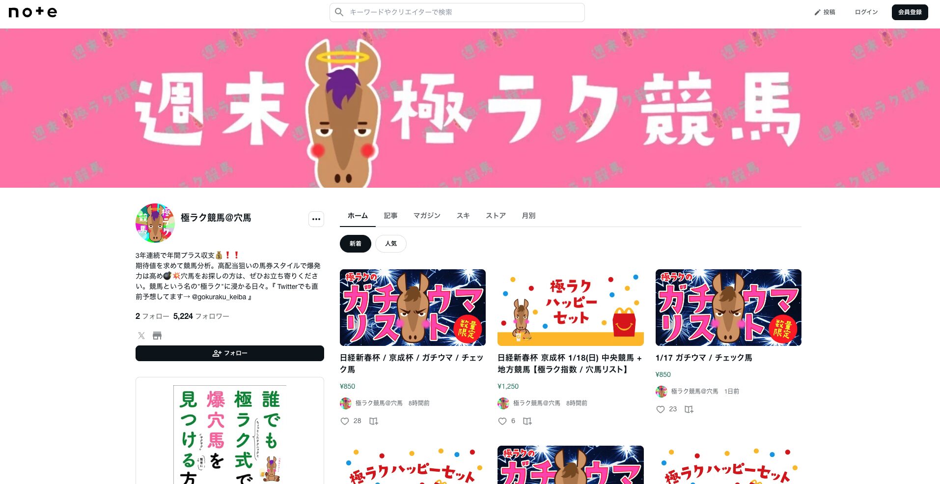 まあひとまず、【極ラク競馬@穴馬】のnoteを見ていきましょうか。