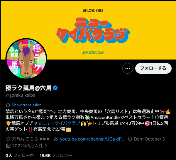 【極ラク競馬@穴馬】のX(Twitter)