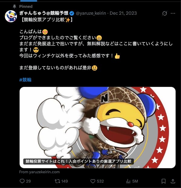 競輪インフルエンサー・【ぎゃんちゅう@競輪予想】のX(Twitter)はこんな感じ