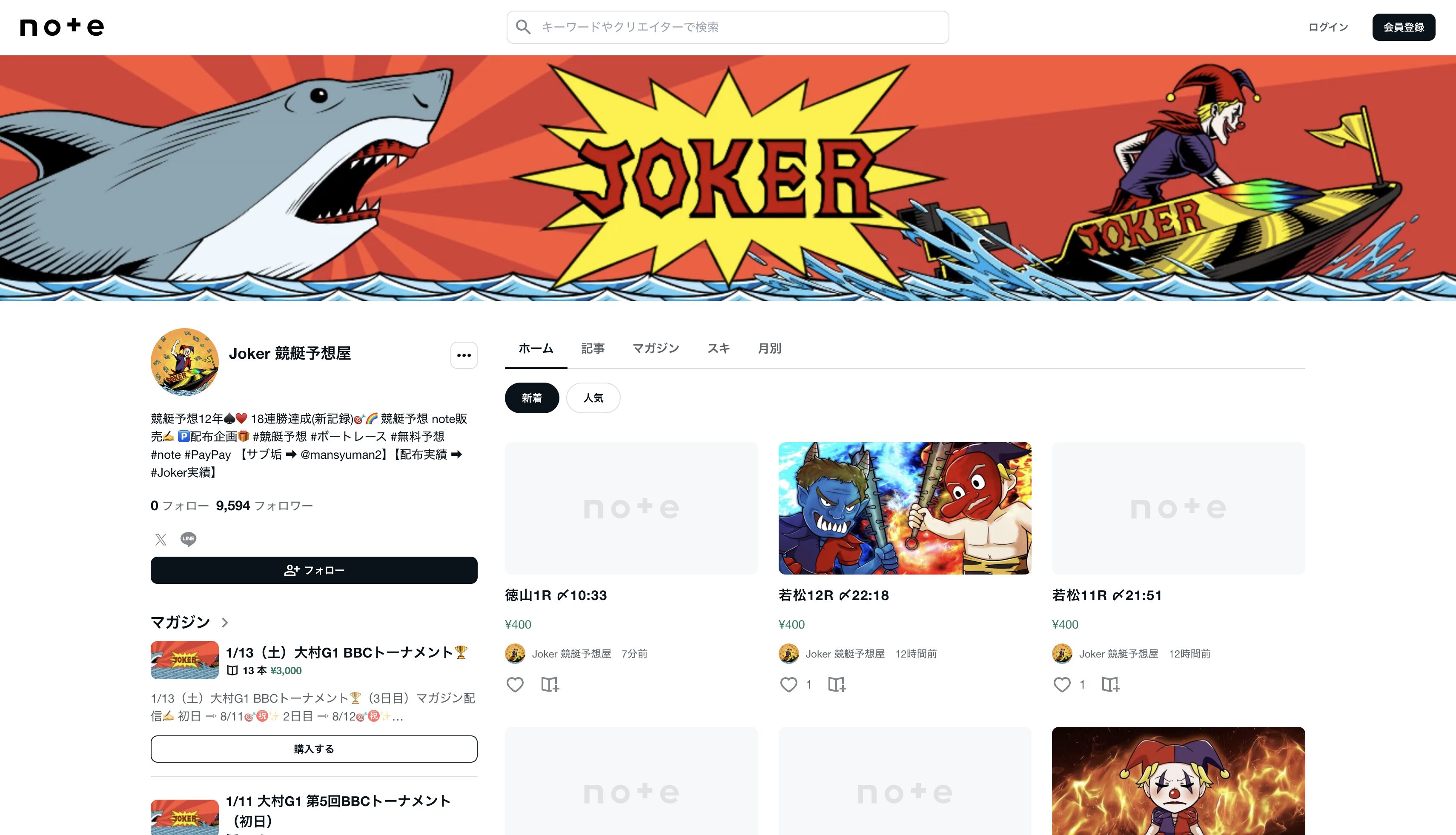 まあひとまずプロフィールにもあった通り、【ジョーカー競艇予想屋】のnoteを見ていきましょうか。
