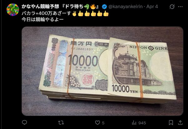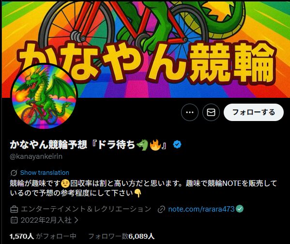 競輪インフルエンサー・【かなやん競輪予想ドラ待ち🐲🔥』】のX(Twitter)はこんな感じ