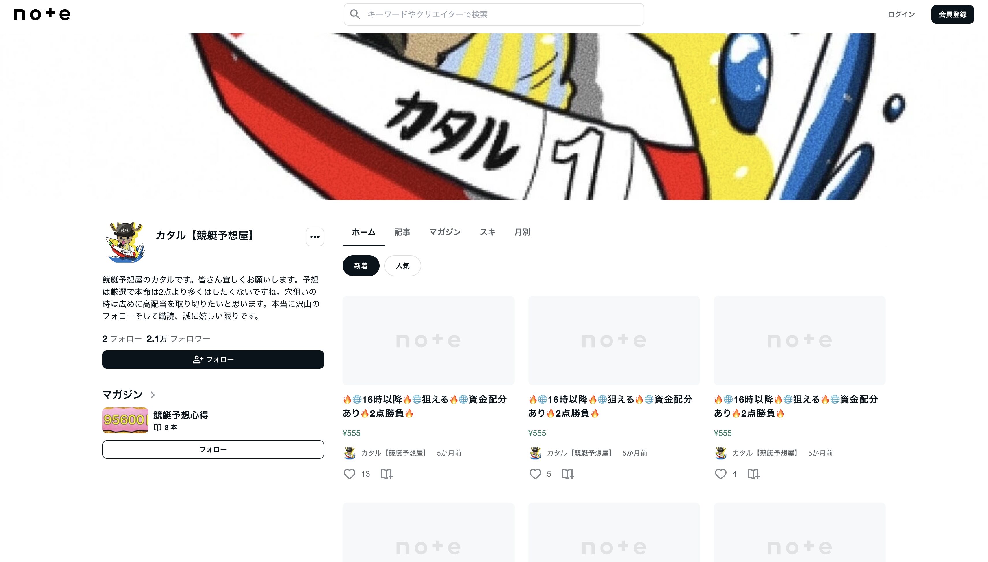 まあひとまずプロフィールにもあった通り、『カタル【競艇予想屋】』のnoteを見ていきましょうか。
