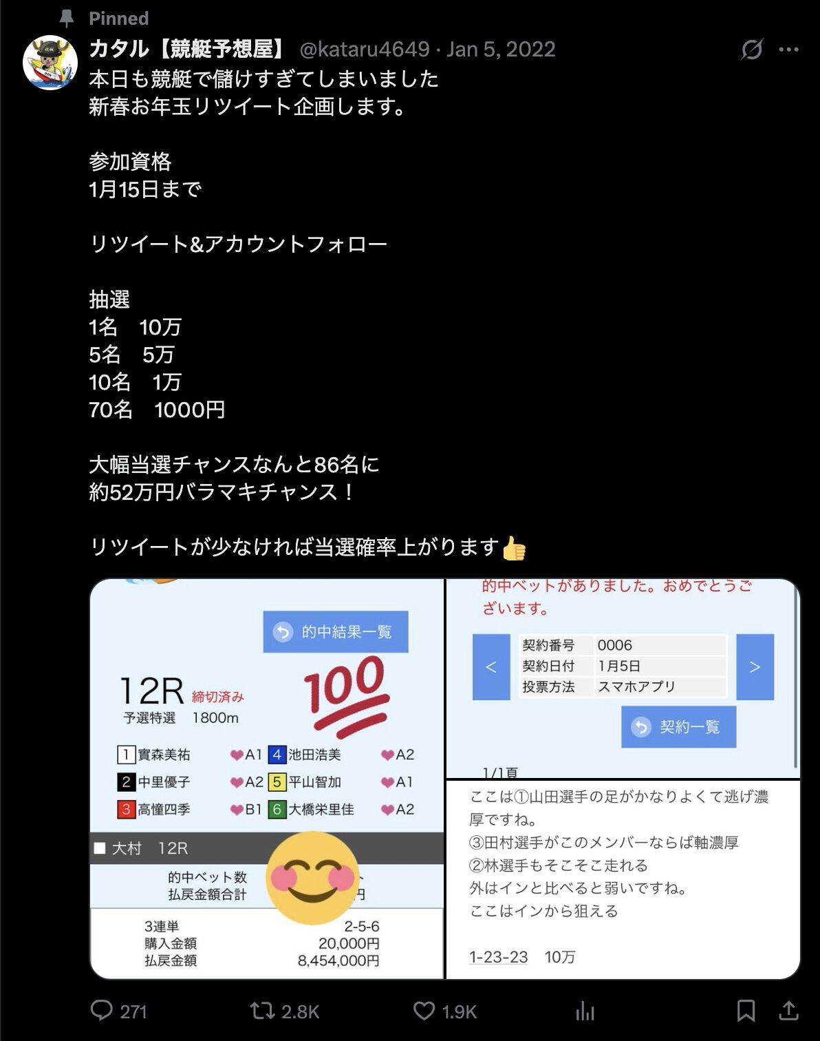 『カタル【競艇予想屋】』は投稿を見る限りだとプレゼント企画をやっているみたいです。