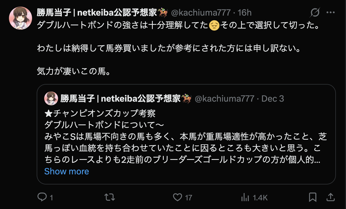 競馬インフルエンサー・【勝馬当子netkeiba公認予想家🏇】のX(Twitter)はこんな感じ