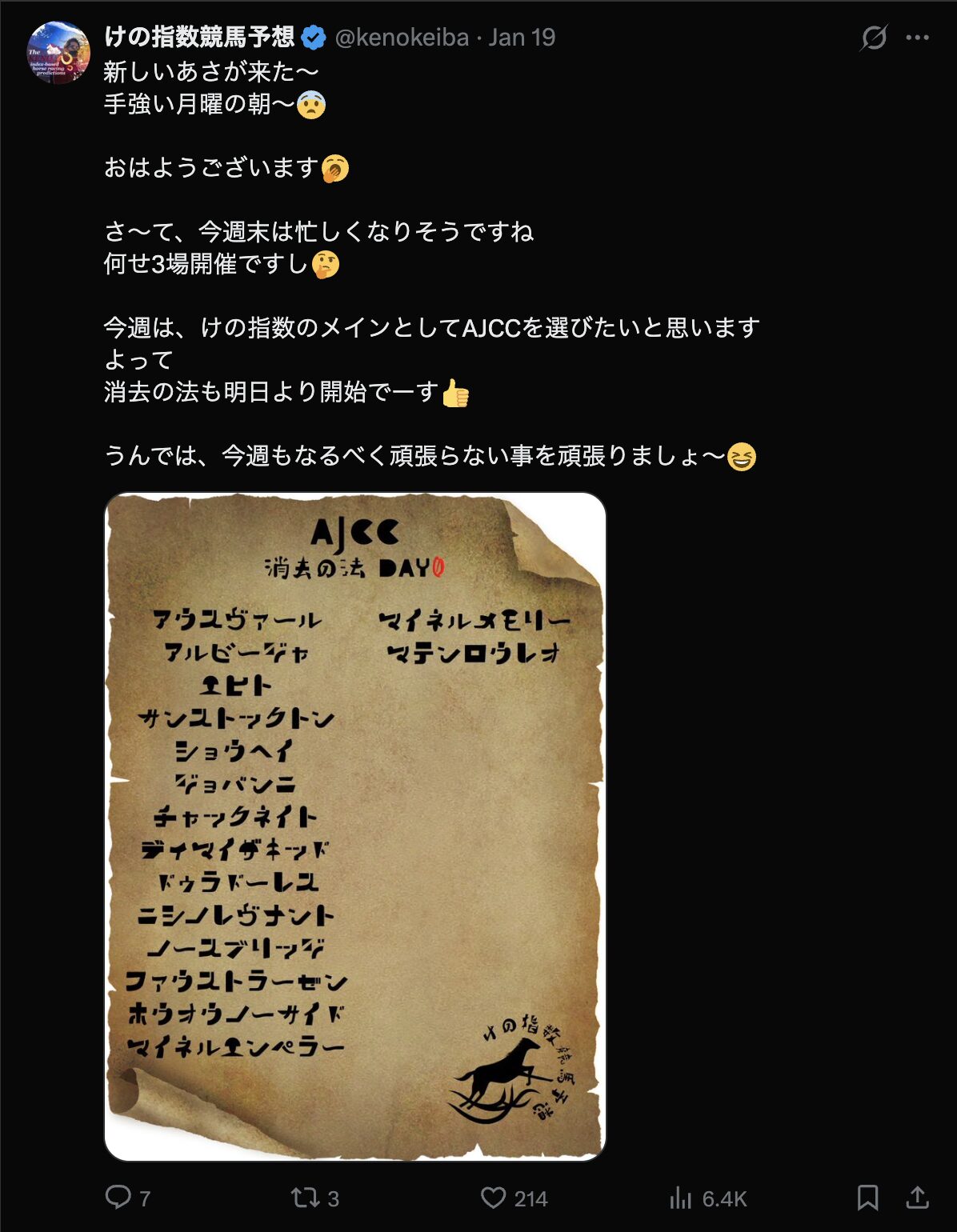 競馬インフルエンサー・【けの指数競馬予想】のX(Twitter)はこんな感じ