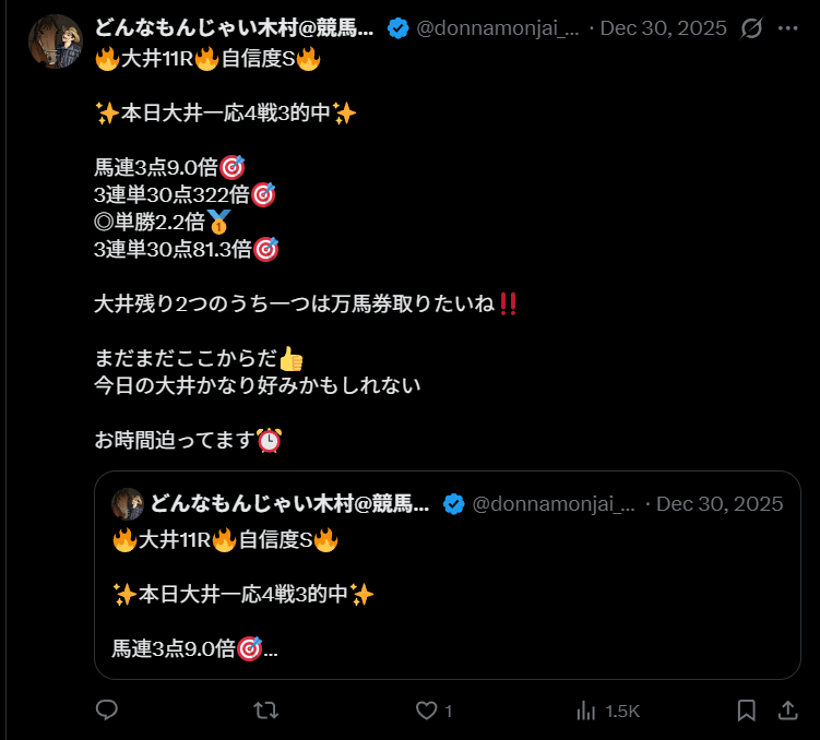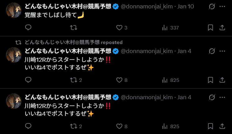 競馬インフルエンサー・【どうせじゃない木村@競馬予想】のX(Twitter)はこんな感じ