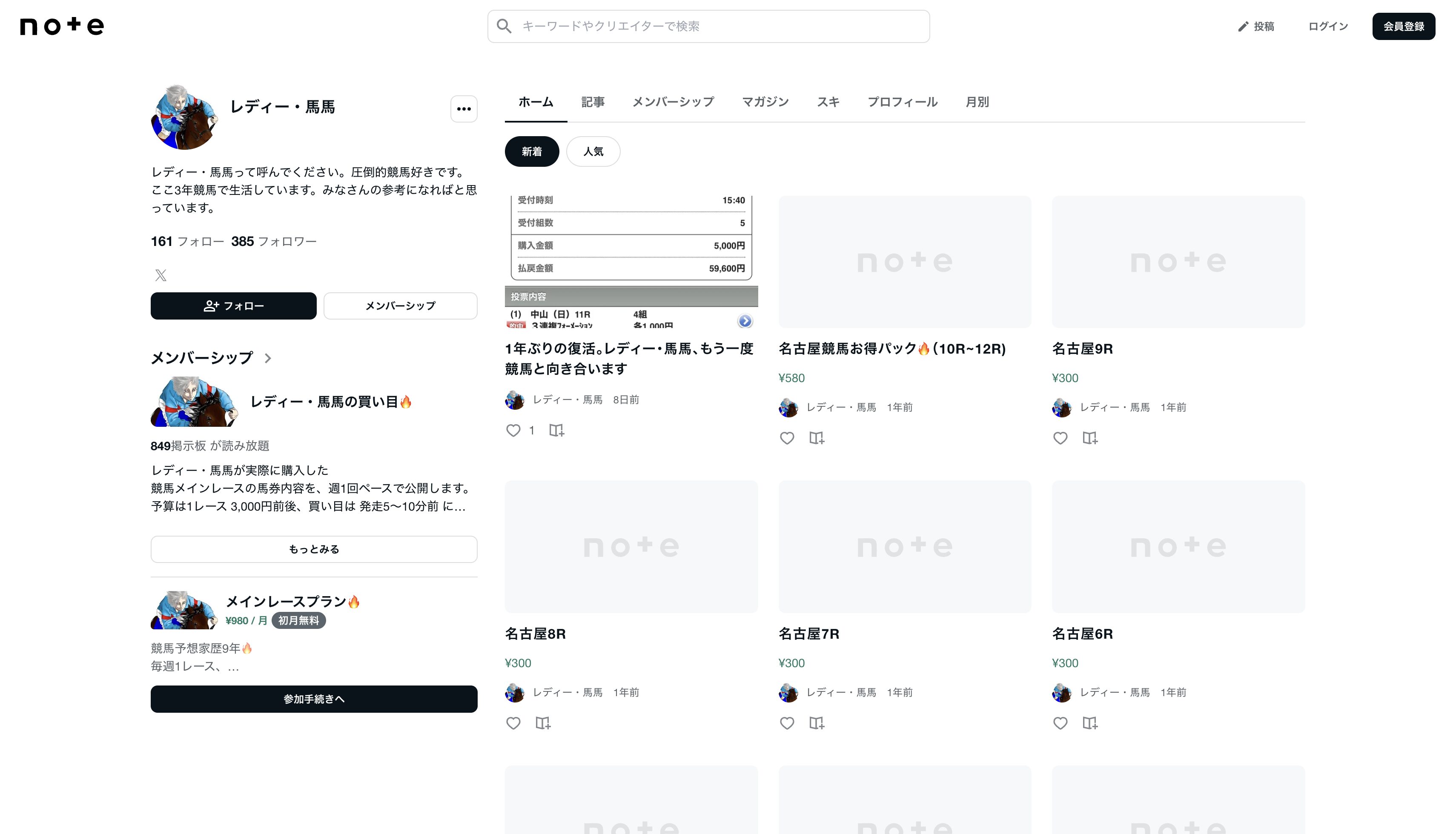 まあひとまず、【レディー・馬馬 (競馬予想家)】のnoteを見ていきましょうか。