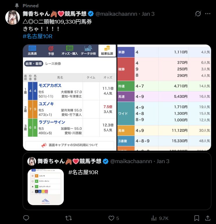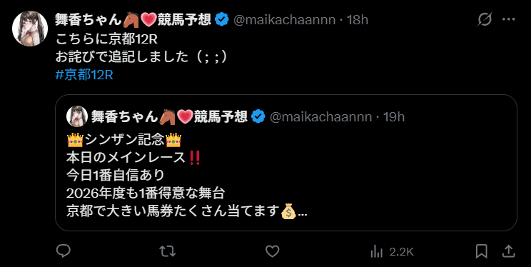 競馬インフルエンサー・【舞香ちゃん🐴💗競馬予想】のX(Twitter)はこんな感じ