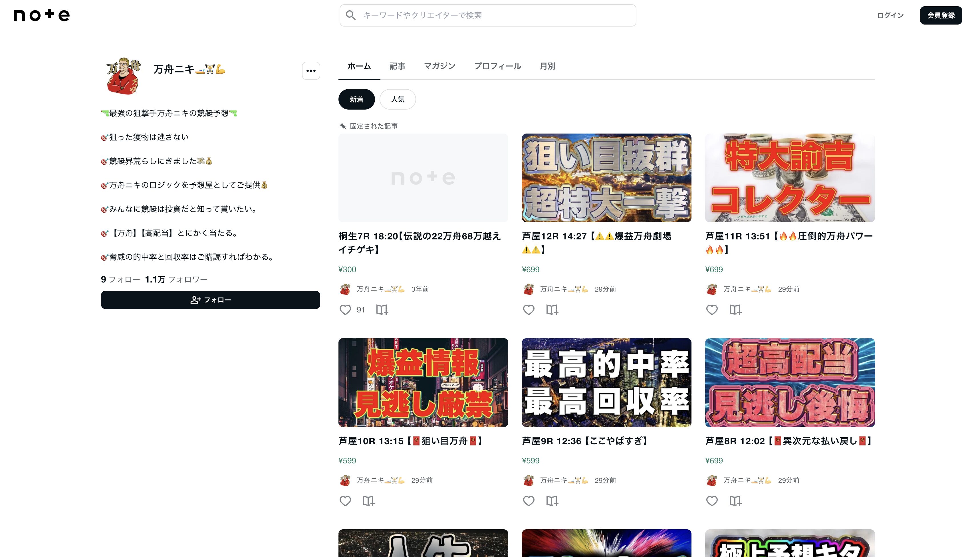 まあひとまずプロフィールにもあった通り、【万舟ニキ🚤💵競艇予想】のnoteを見ていきましょうか。