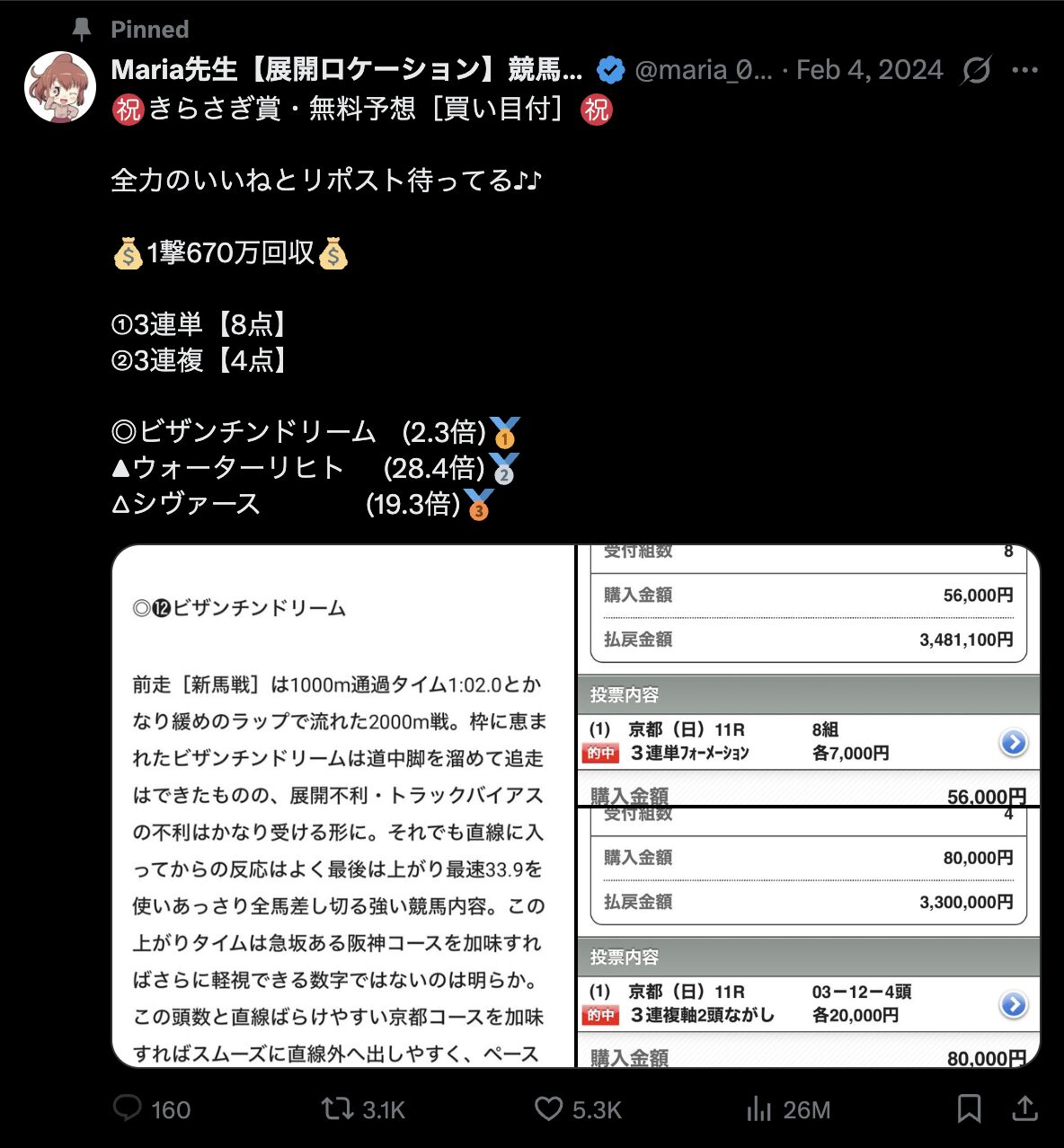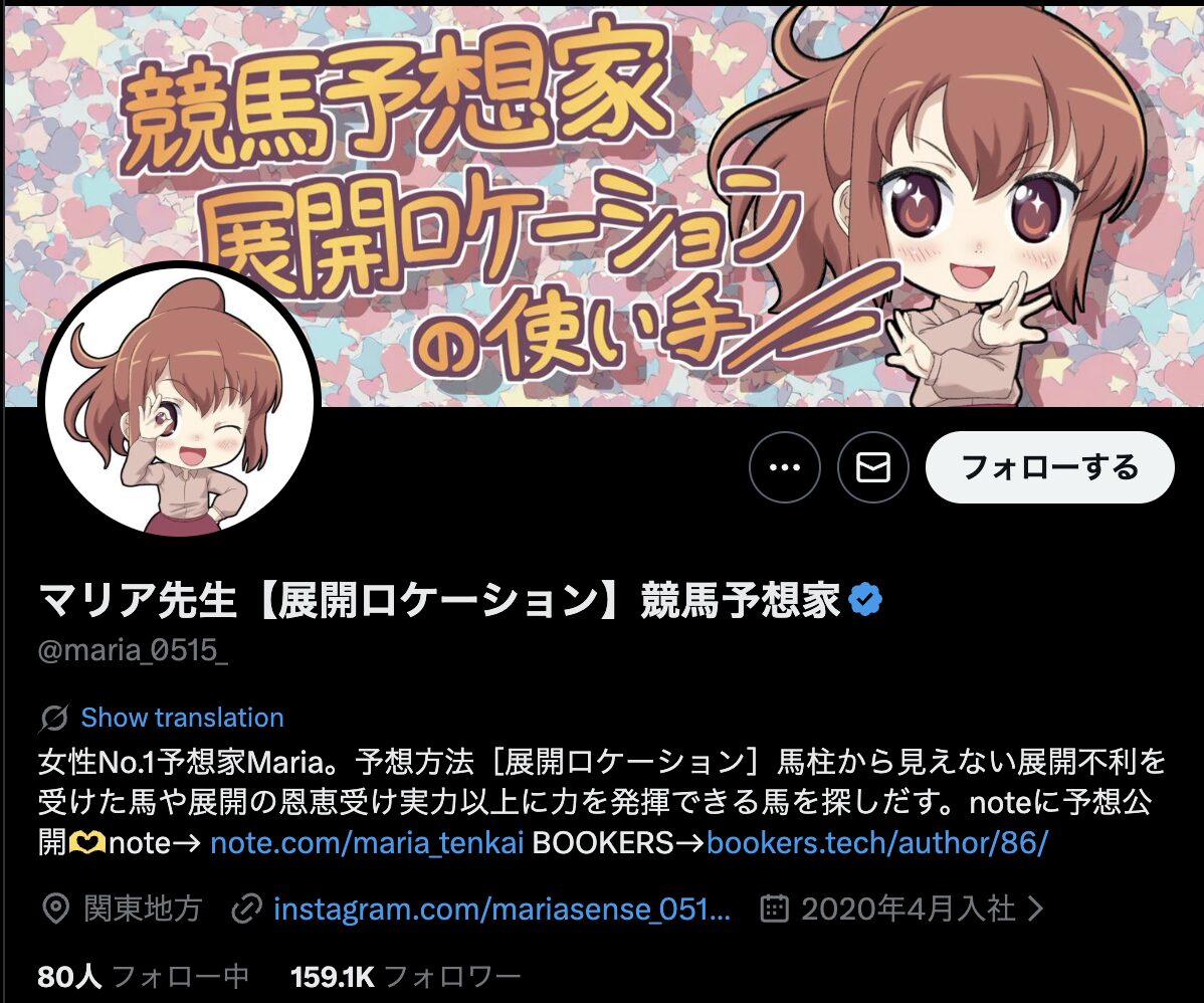 「マリア先生【展開ロケーション】競馬予想家」のX(Twitter)