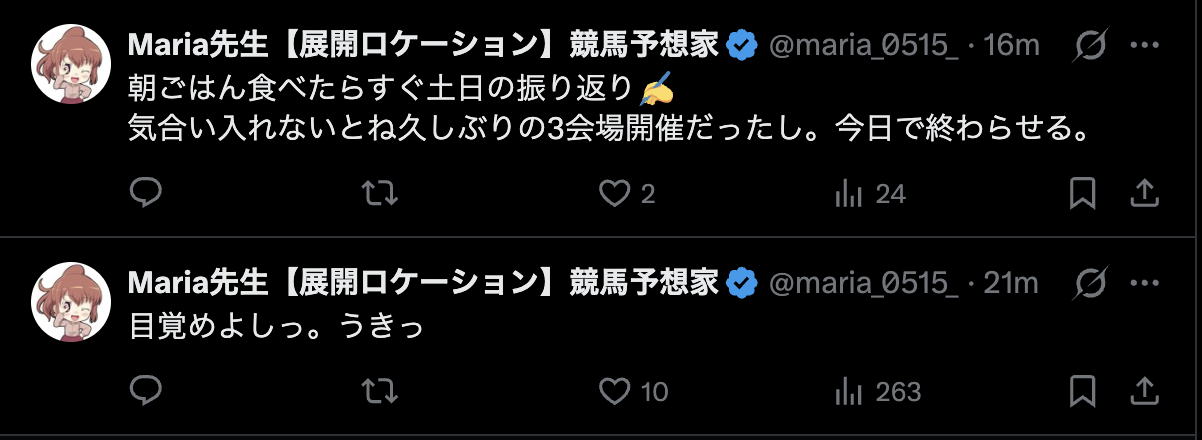 競馬インフルエンサー・「マリア先生【展開ロケーション】競馬予想家」のX(Twitter)はこんな感じ