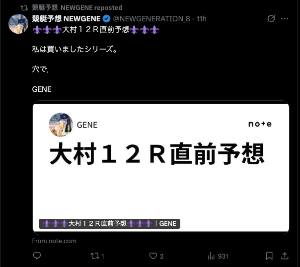 早速、【競艇予想 NEWGENE】のnoteに飛んでみました。