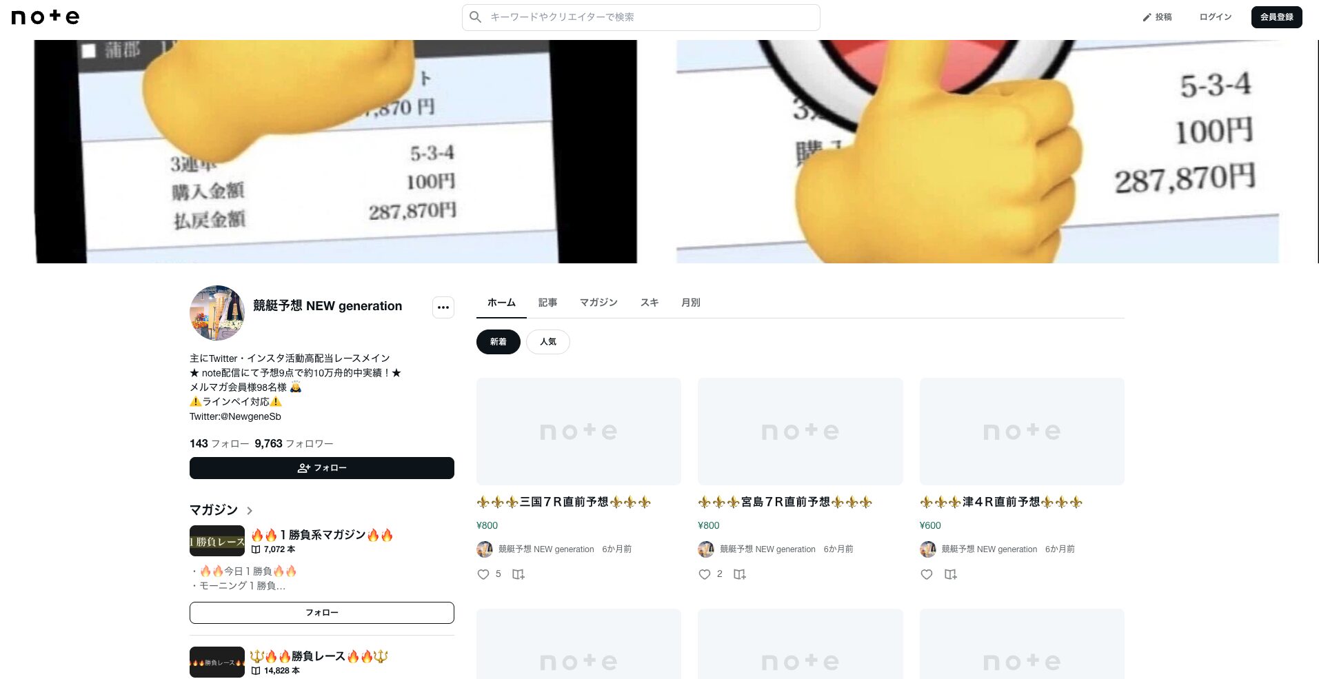 まあひとまずプロフィールにもあった通り、【競艇予想 NEWGENE】のnoteを見ていきましょうか。