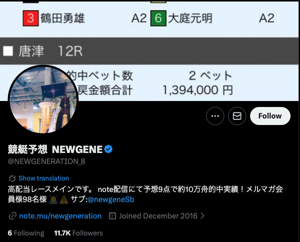 競艇インフルエンサー・【競艇予想 NEWGENE】のX(Twitter)はこんな感じ