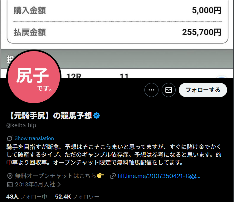 競馬インフルエンサー『【元騎手尻】の競馬予想(尻子の競馬予想)』のプロフィール