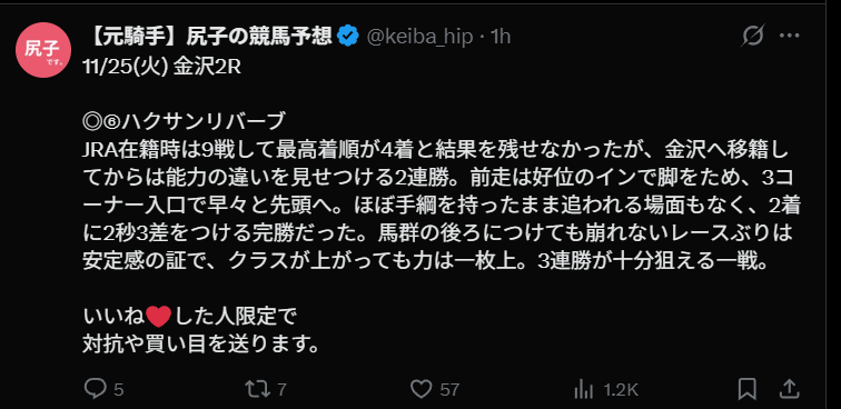 競馬インフルエンサー・『【元騎手尻】の競馬予想(尻子の競馬予想)』のX(Twitter)はこんな感じ
