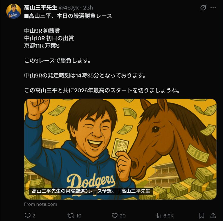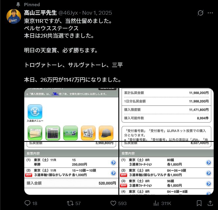 競馬インフルエンサー・【高山三平先生】のX(Twitter)はこんな感じ