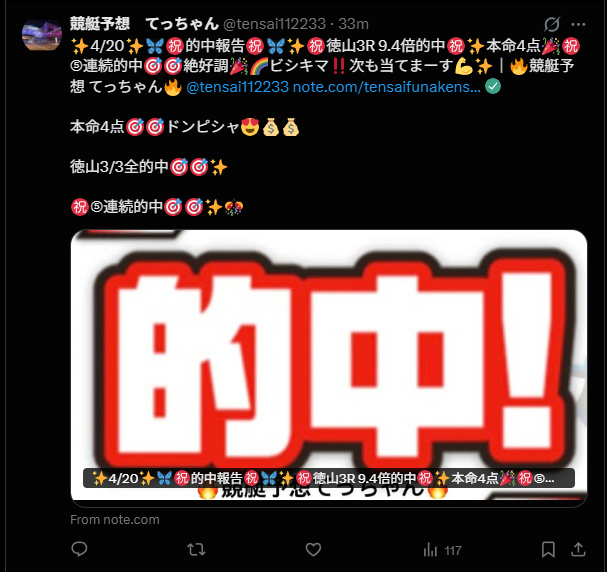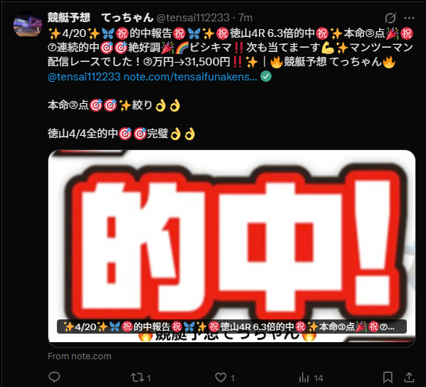 競艇インフルエンサー・【競艇予想てっちゃん】のX(Twitter)はこんな感じ