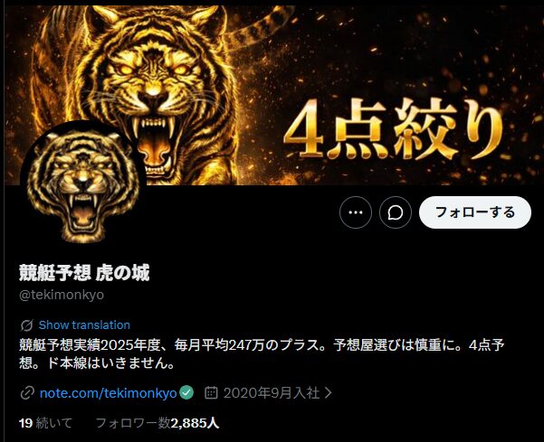 競艇インフルエンサー・【競艇予想 虎の城】のX(Twitter)はこんな感じ