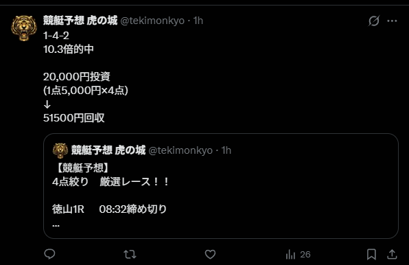 【競艇予想 虎の城】のX(Twitter)