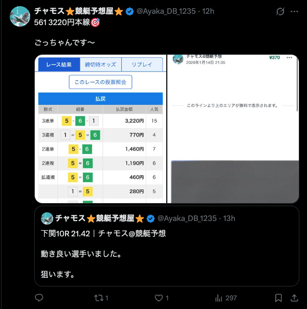 【チャモス⭐️競艇予想屋@Ayaka_DB_1235⭐️】に対する評判は?