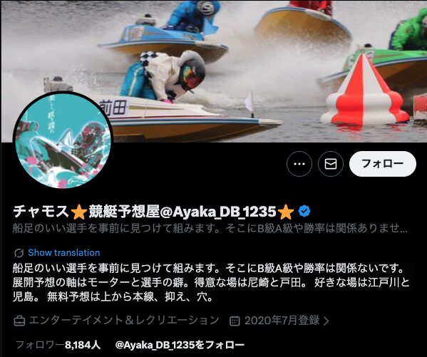 まずは【チャモス⭐️競艇予想屋@Ayaka_DB_1235⭐️】がどんな人物かを紹介していきます。