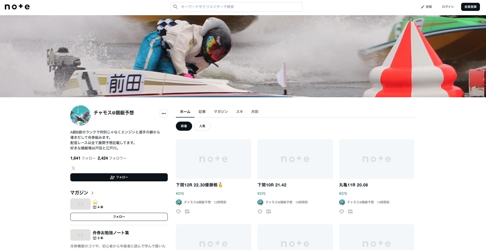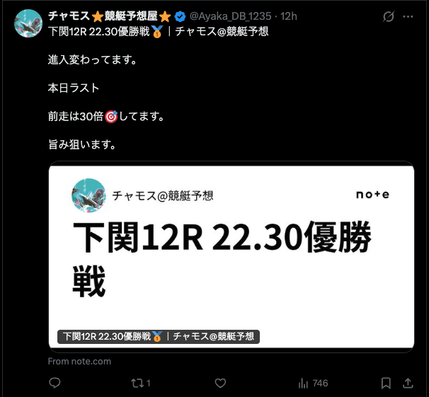 早速、【チャモス⭐️競艇予想屋@Ayaka_DB_1235⭐️】のnoteに飛んでみました。