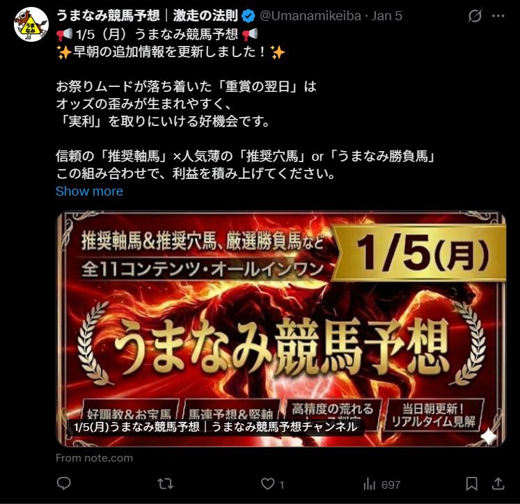 早速、【うまなみ競馬予想|激走の法則】のnoteに飛んでみました。