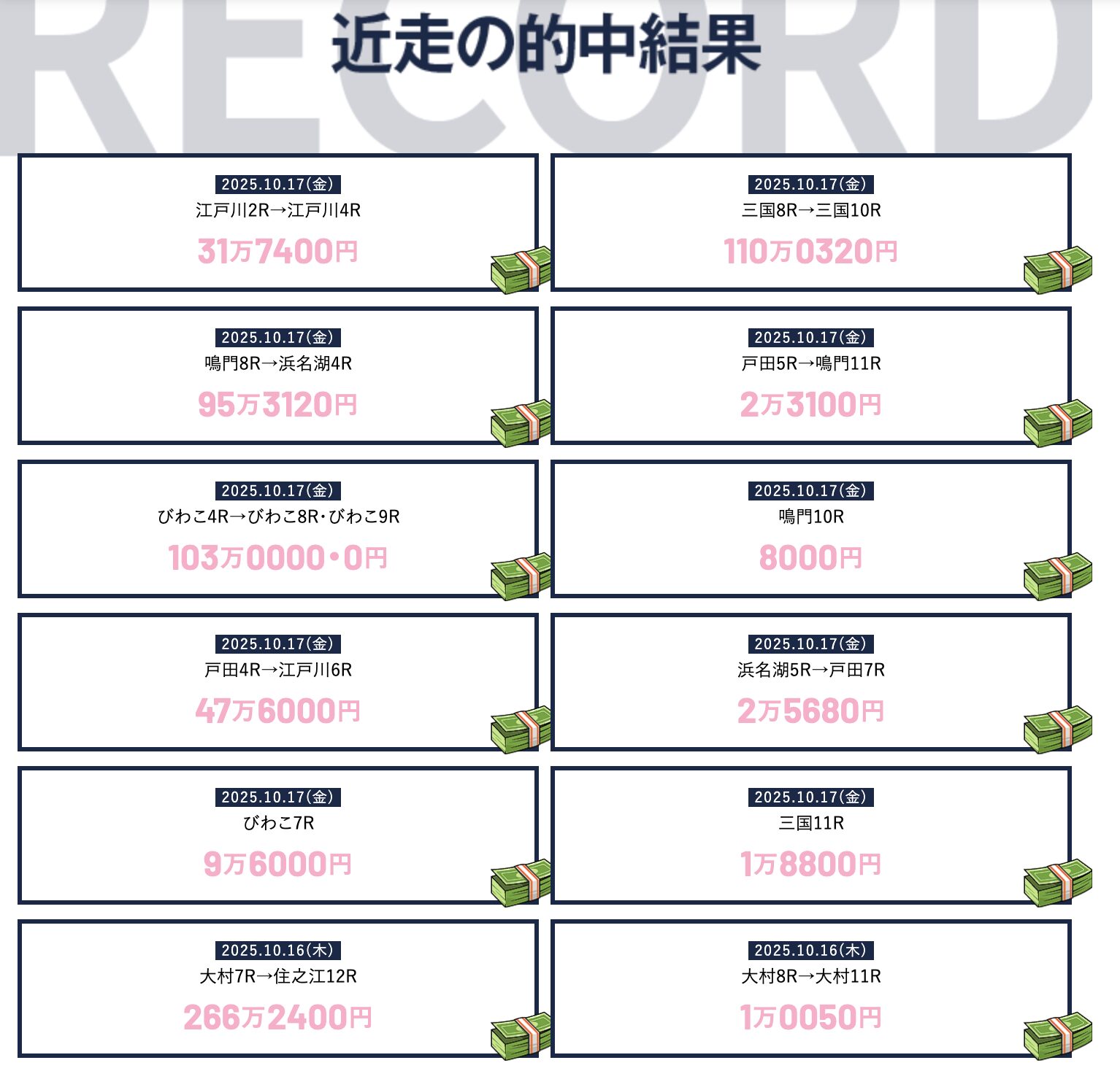 これは直近の的中実績みたいですが、右側にある鳴門10Rなんか、これ舟券代いくらで何点で購入してるんですかね?