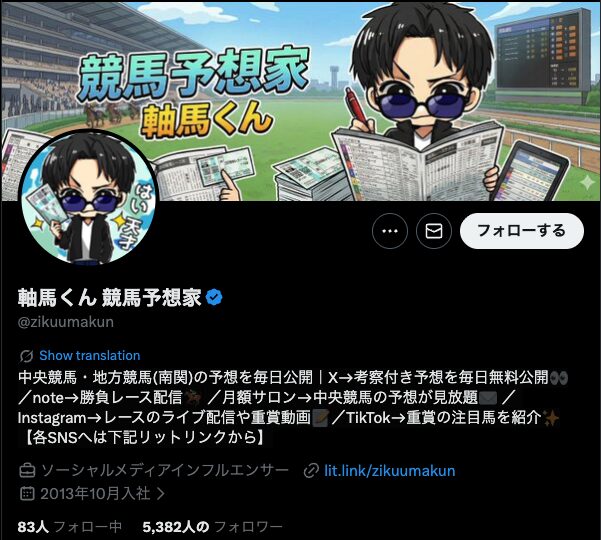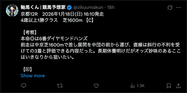 競馬インフルエンサー・【軸馬くん 競馬予想家】のX(Twitter)はこんな感じ